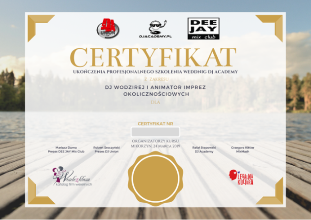 – Certyfikat ukończenia szkolenia sygnowany markami organizatorów: DEE JAY MIX CLUB, DJ UNION, DJ ACADEMY