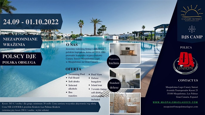 Polscy DJs, polska obsługa typu Concierge, wszystko w cenie, wycieczka dookoła wyspy z polskim Przewodnikiem, 3 imprezy, w tym jedna na ekskluzywnym katamaranie, transfery autokarowe, najpiękniejsze miejsca na Gran Canaria!