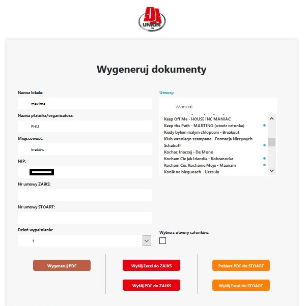 Każdy członek DJ Union może zalogować się w przygotowanym dla Was systemie i w prosty sposób za jednym razem przygotować, wysłać lub pobrać i wydrukować druki odtwarzanych przez Was utworów, które należy składać do ZAiKS i do STOART.
